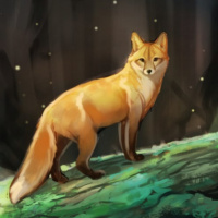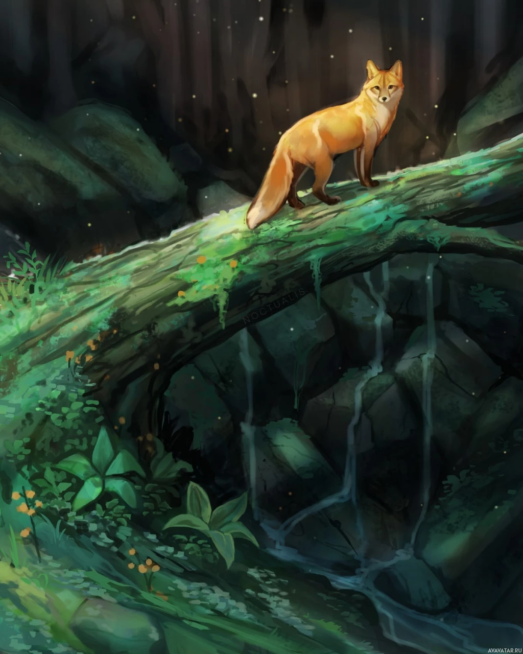 На картинке изображена лиса, стоящая на краю скалистого обрыва, откуда открывается вид на густой лес. Внизу протекает небольшой водопад или ручей. Скорее всего, действие происходит в сумерках или на рассвете, учитывая мягкий свет, освещающий окружающую среду. Лиса выглядит настороженной и, возможно, наблюдает за чем-то вдалеке или просто наслаждается своим насестом.