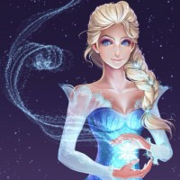a young woman with long blonde hair and blue eyes. Elsa is wearing her signature ice-