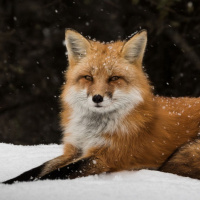 a red fox sitting in the snow. The fox appears to be resting or possibly observing its surroundings, given that it's looking at something in the distance with its eyes open. The environment is cold and wintery, suggesting the photo was taken during
