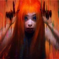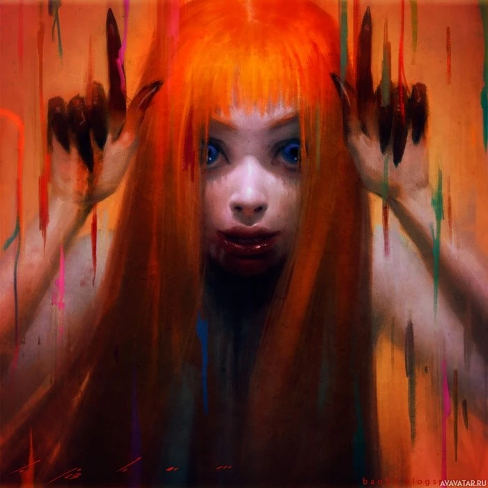 red hair, who appears to be a girl. She is looking directly at the viewer and seems to have a somewhat disturbed or intense expression on her face. The background consists of bright