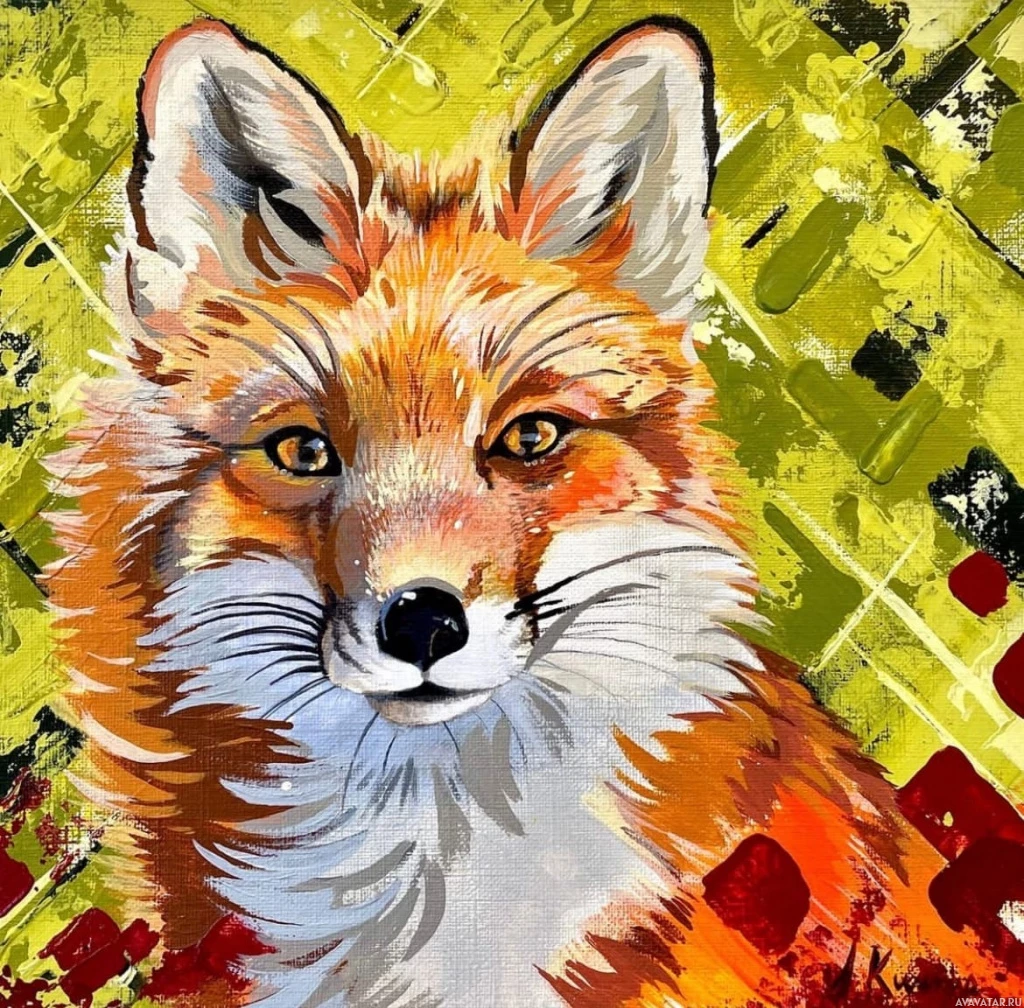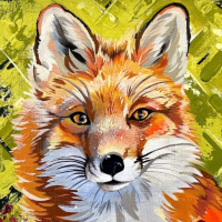 The picture features a vibrant and stylized painting of a fox. It showcases the animal's face in close-up, with prominent facial features such as its eyes, nose, mouth, and whiskers clearly depicted. The background includes