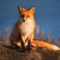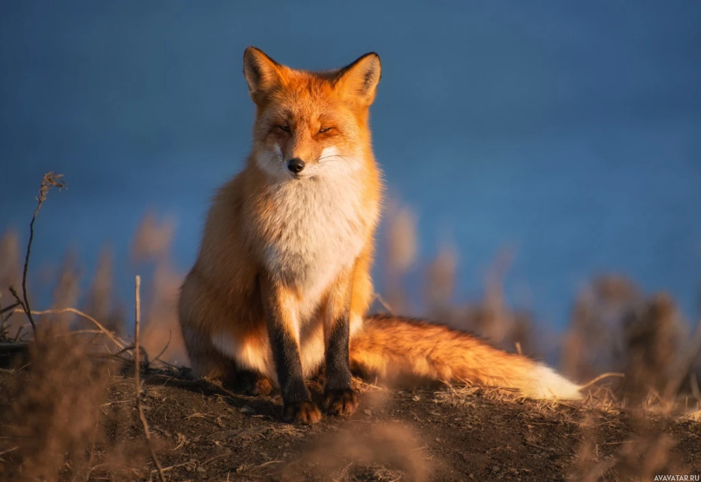 На картинке изображена рыжая лиса, сидящая на холме, похожем на холм, поросший травой или кустарником. Лиса стоит лицом к камере, и ее пристальный взгляд говорит о настороженности или любопытстве. Кажется, что это восход или закат солнца из-за теплого света, освещающего сцену.