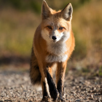 The picture shows a red fox walking on what appears to be a gravel road or path. The fox is looking forward, and its fur looks well-maintained with no visible signs of distress or injury. This image captures the natural behavior of the animal in an outdoor setting, possibly in the wild or in a controlled environment designed for wildlife viewing.