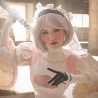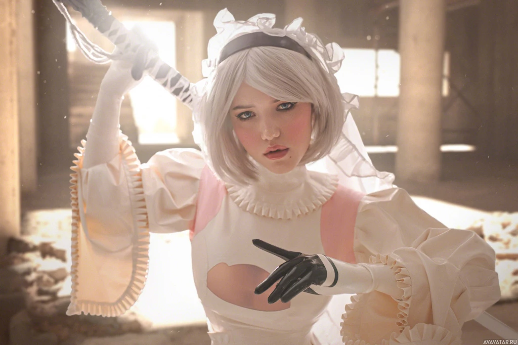На картинке изображен человек, одетый как персонаж "Йорха № 2, тип B" из видеоигры "Nier: Automata". Этот персонаж изображен с элегантной современной внешностью, контрастирующей с традиционным фэнтезийным стилем оригинального дизайна в игре. Костюм для косплея тщательно проработан и сочетает в себе футуристические и классические элементы.
