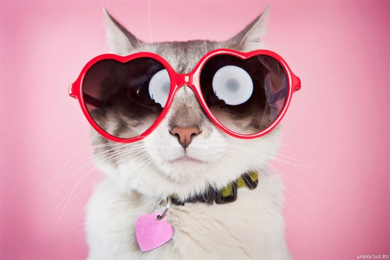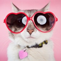 shaped sunglasses. The cat is looking directly at the camera, giving it a somewhat surprised or inquisitive look. It's a whimsical and humorous photo that plays on the idea of humanizing animals by dressing them in accessories typically associated with humans.