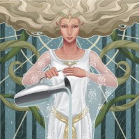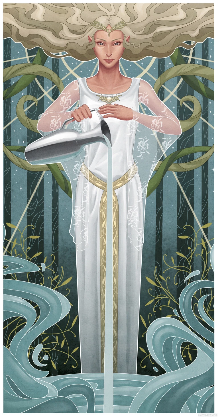 The image depicts a stylized artistic representation of a figure that resembles Galadriel from J.R.R. Tolkien's "The