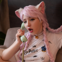 flowing hair and has their legs crossed in a relaxed manner. They are holding an old-fashioned rotary telephone to their ear, suggesting they may be engaged in