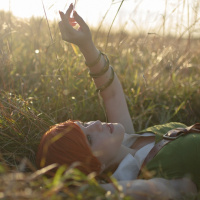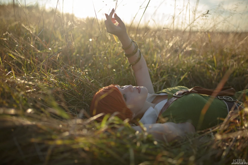 red hair and is dressed in an outfit that resembles the attire of Shani from "The Witcher" game series, specifically as portrayed by the actress Anna Shaffer. The setting sun casts a warm glow on the scene, enhancing