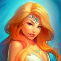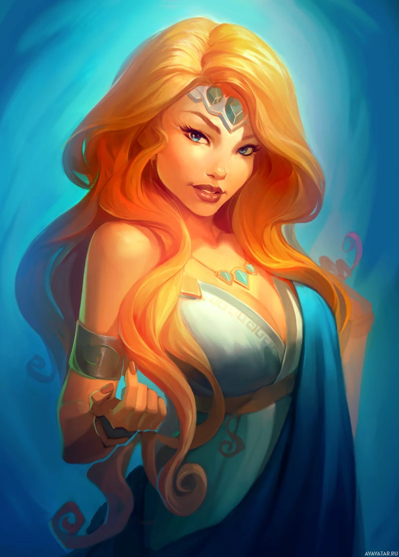 a female figure with blonde hair and striking red eyes. She is depicted in what seems to be an ancient or fantasy-style attire, including a blue garment with