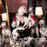 cosplay culture, where individuals dress up as characters from films, television shows, or other forms of media. The costume suggests that she could be portraying a character known for interacting with animals, such as Cruella de Vil from "101 Dalmatians."