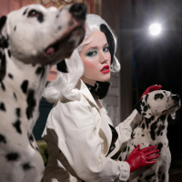 blonde hair, and her makeup includes red lipstick and a darkened eyebrow look. In the foreground, there are two Dalmation dogs with their
