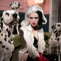 Dalmatian dogs, which appear attentive towards her. The setting appears to be indoors, and there's a decorative light fixture in the background that adds to
