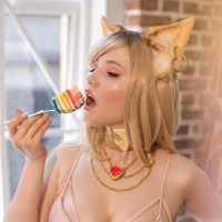 The image shows a person dressed in cosplay, wearing makeup and a costume that resembles the character Ahri from the game "