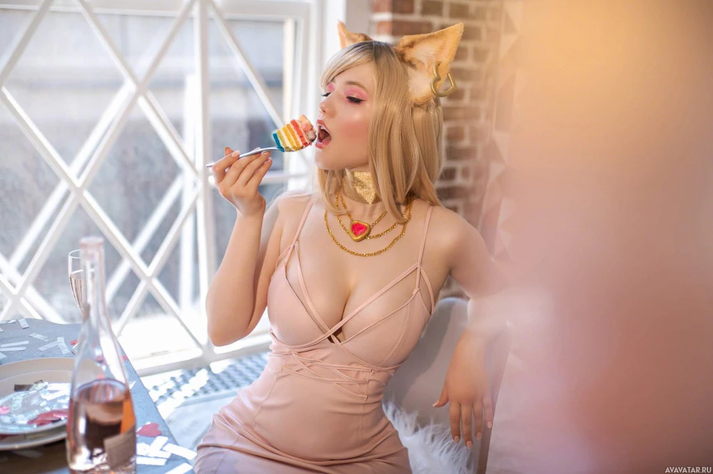 a window in the background and items like bottles and a plate on the table. There's no indication that this is related to confection or Ahri beyond the costume and closed-