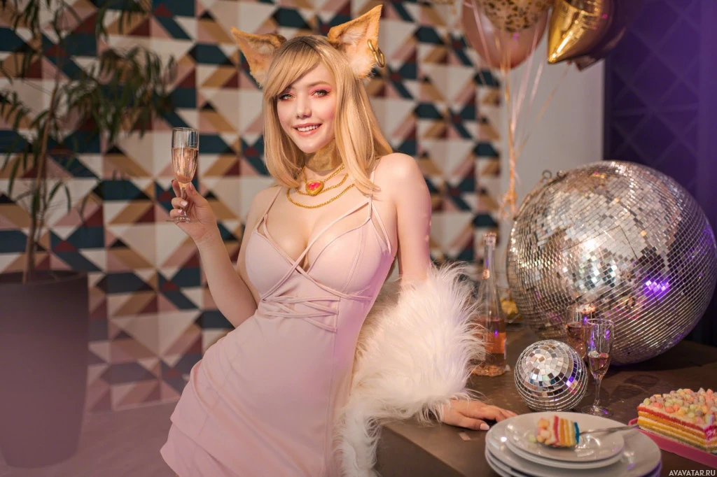 The image depicts a person dressed in a costume that resembles the character Ahri from
