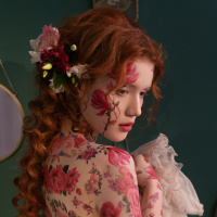 a floral pattern, complementing the theme of flowers around her head as well. Her attire consists of what appears to be an elegant and possibly vintage-style dress with lace elements. The background suggests