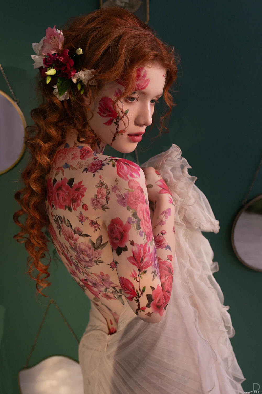 red hair wearing makeup that includes flowers on her face. She has a tattoo or painted design on her back that resembles