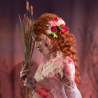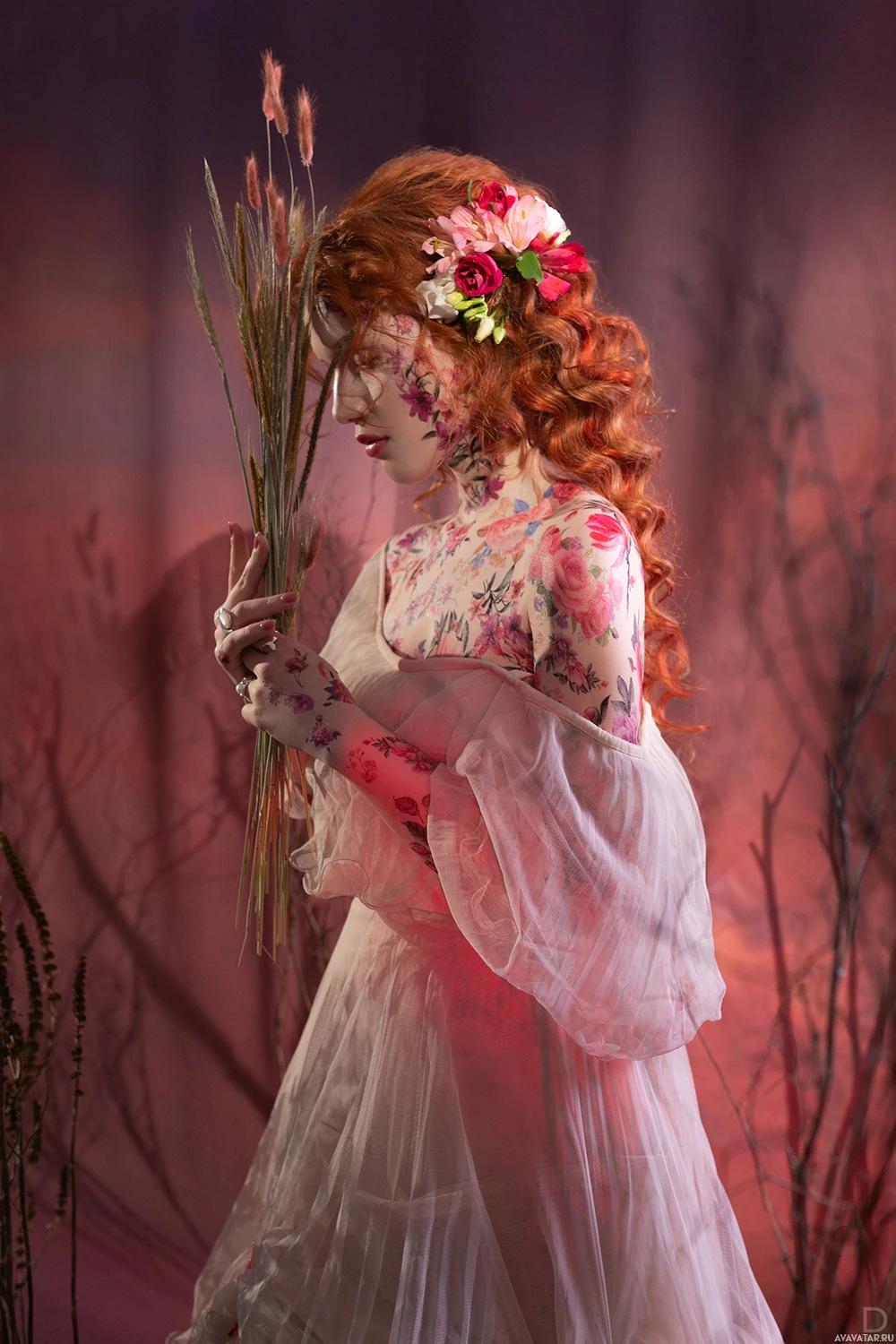 red hair wearing a floral crown and holding what appears to be a bouquet of flowers. They have painted designs on their skin, particularly around the neck and shoulders. The individual has closed eyes and seems to be in a contemplative or perhaps