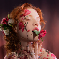 the flower decoration on her face. There are also flowers adorning her hands and around her neck.