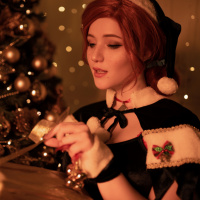 In the image, there is a person dressed in an outfit that resembles Triss Merigold from