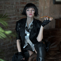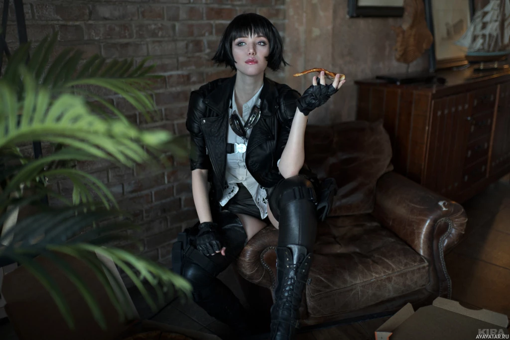 a cosplay outfit or a themed fashion choice. She also appears to have some form of armor on her hands, which might be from a game or
