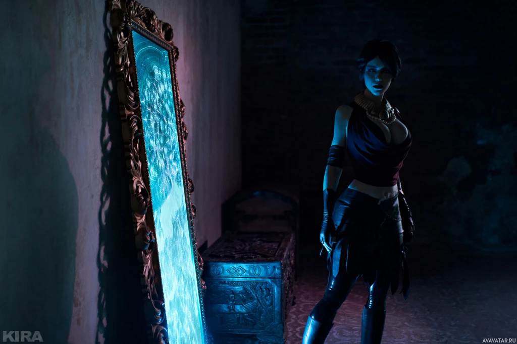 the video game "Dragon Age." The character is portrayed standing in front of a mirror, which adds