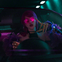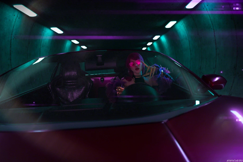 a reflective surface that gives off a pinkish hue, possibly due to neon or lighting effects. Inside the vehicle, there are two characters; one appears to be a masked person in the driver's seat, and another character is visible through