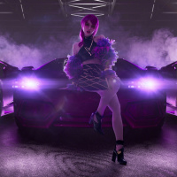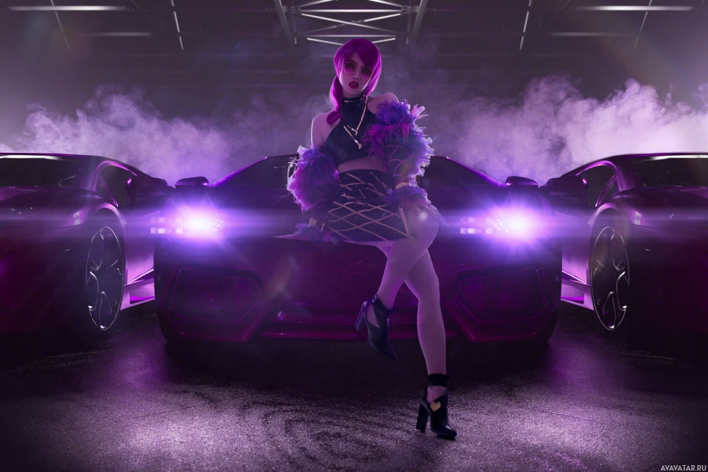 luxury cars, which are likely part of the cosplay theme or setting for the photo.