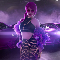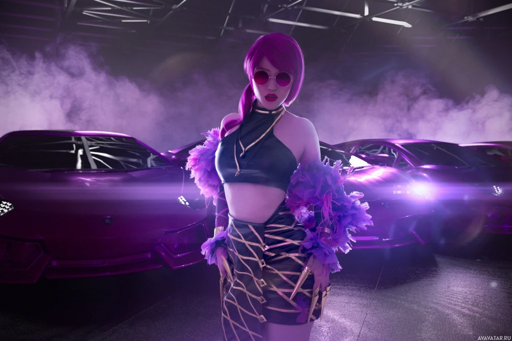 cosplay outfit, which includes a top and bottom with a purple and pink color scheme that is consistent with the theme of the character's abilities and overall design within the game. Behind her are several luxury cars, which adds to the opulent and high-end