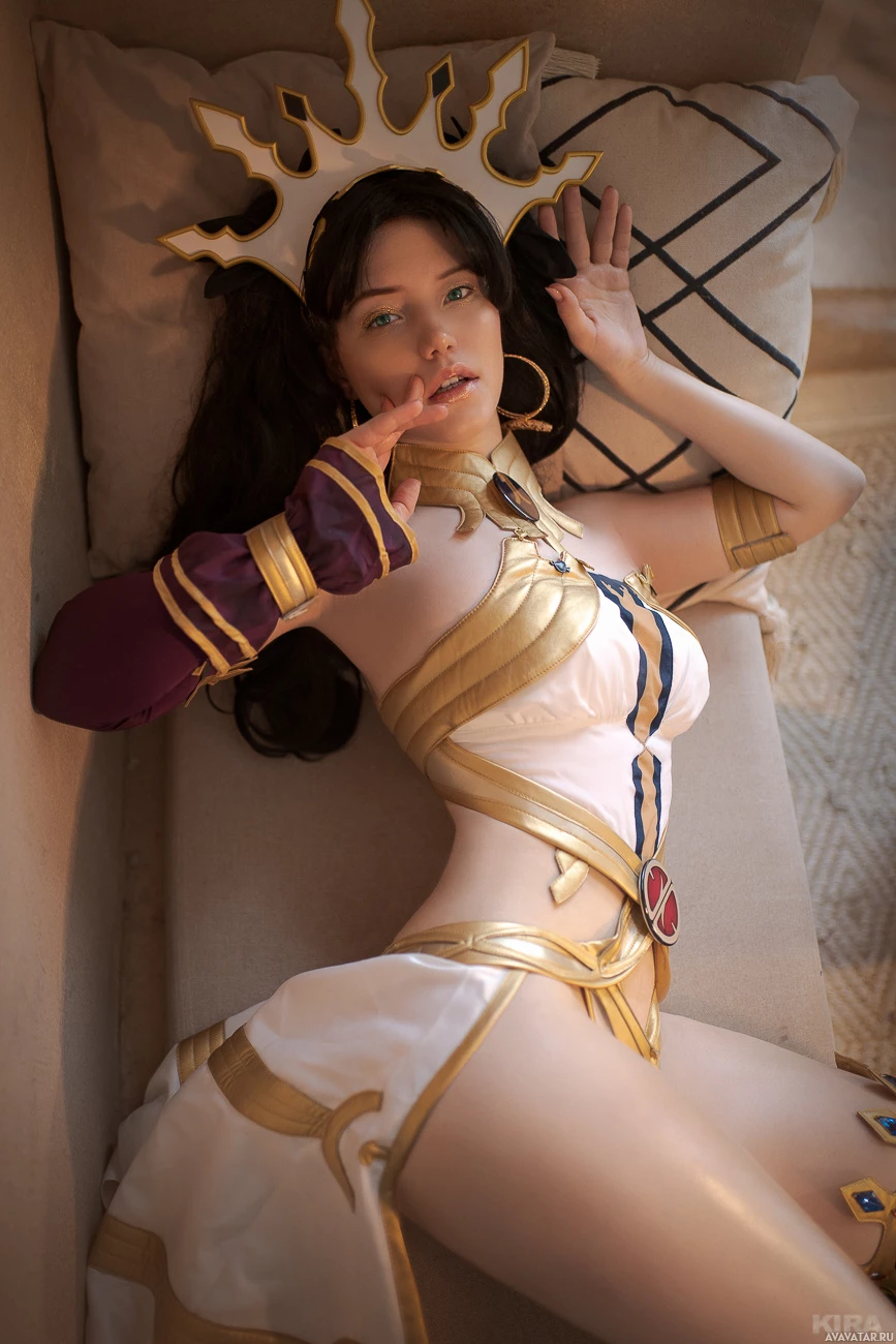 cosplay character. They are lying down with one hand resting on their face and the other arm extended, holding what appears to be a staff or weapon. The costume includes a crown-like headpiece, a corset, and