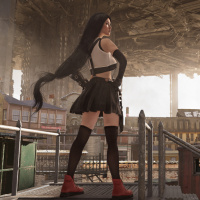 dilapidated buildings and debris scattered around her feet. This scene could be from