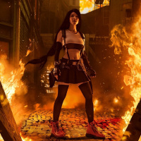 a female character from a video game, who is cosplaying the character she portrays in-game. She is standing in