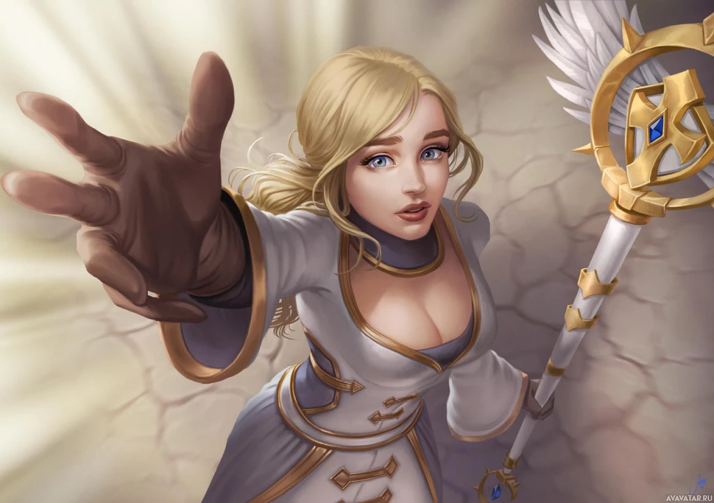 a female character with blonde hair and blue eyes. She has an angelic appearance, wearing a white outfit adorned with