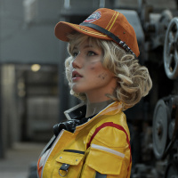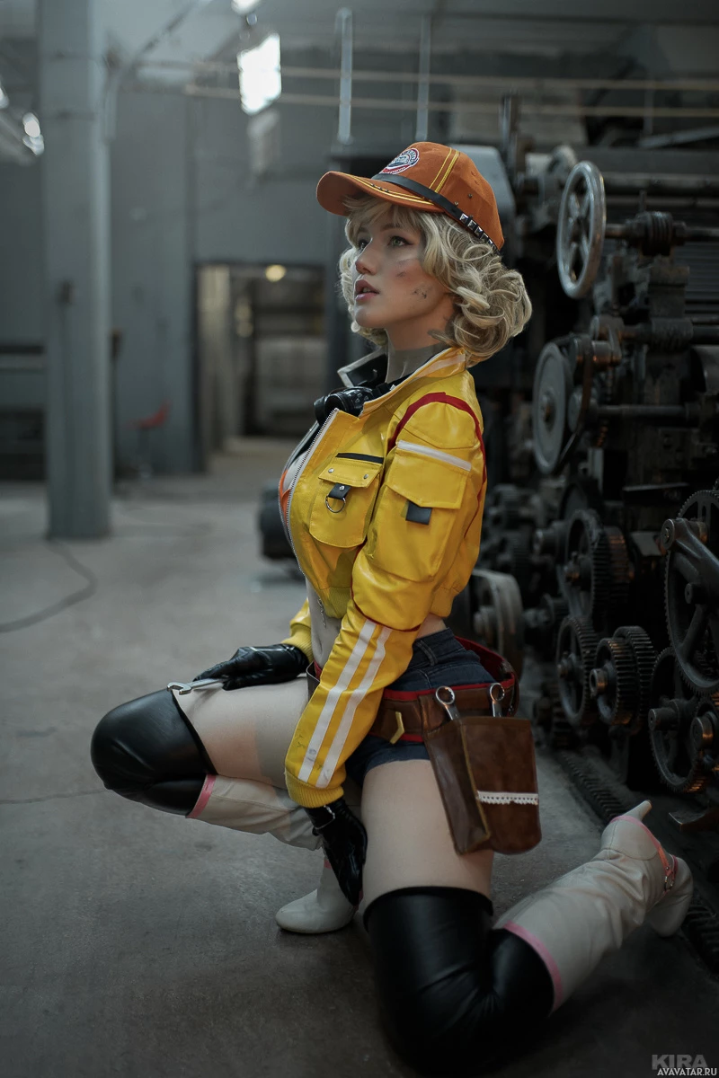a yellow jacket with the name "Lara" on it, a hat, and is holding a holster with what appears to be ammunition or a game controller. They are sitting on an industrial floor with machinery in the background, posing for the photo with