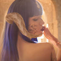 an arched doorway with architectural details that might indicate a historical or fantastical location, which is often common in cosplay photography for visual themes or to enhance the immersion into the character being played.