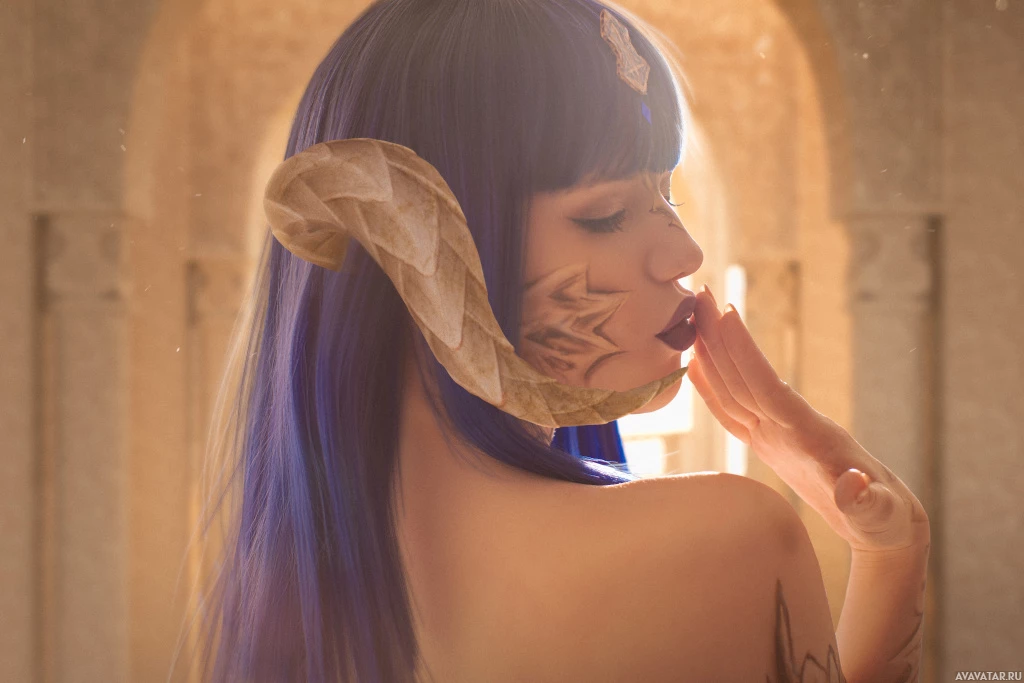 The image features a person who appears to be cosplaying as a character, possibly from