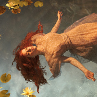 lily pads. Her dress appears to be flowing, suggesting movement as if she is in mid-dance or perhaps sinking into the water. The overall atmosphere of the picture is peaceful yet surreal.