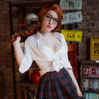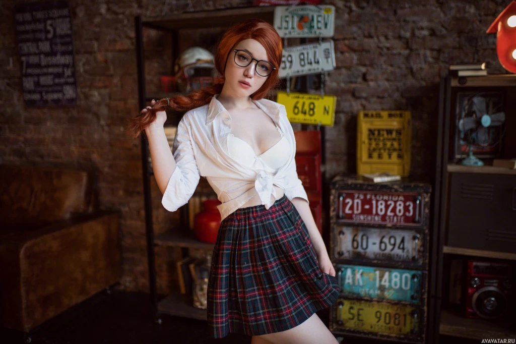 red hair, dressed in a school uniform consisting of a short skirt and a collared shirt. They are standing indoors, possibly in a room decorated with