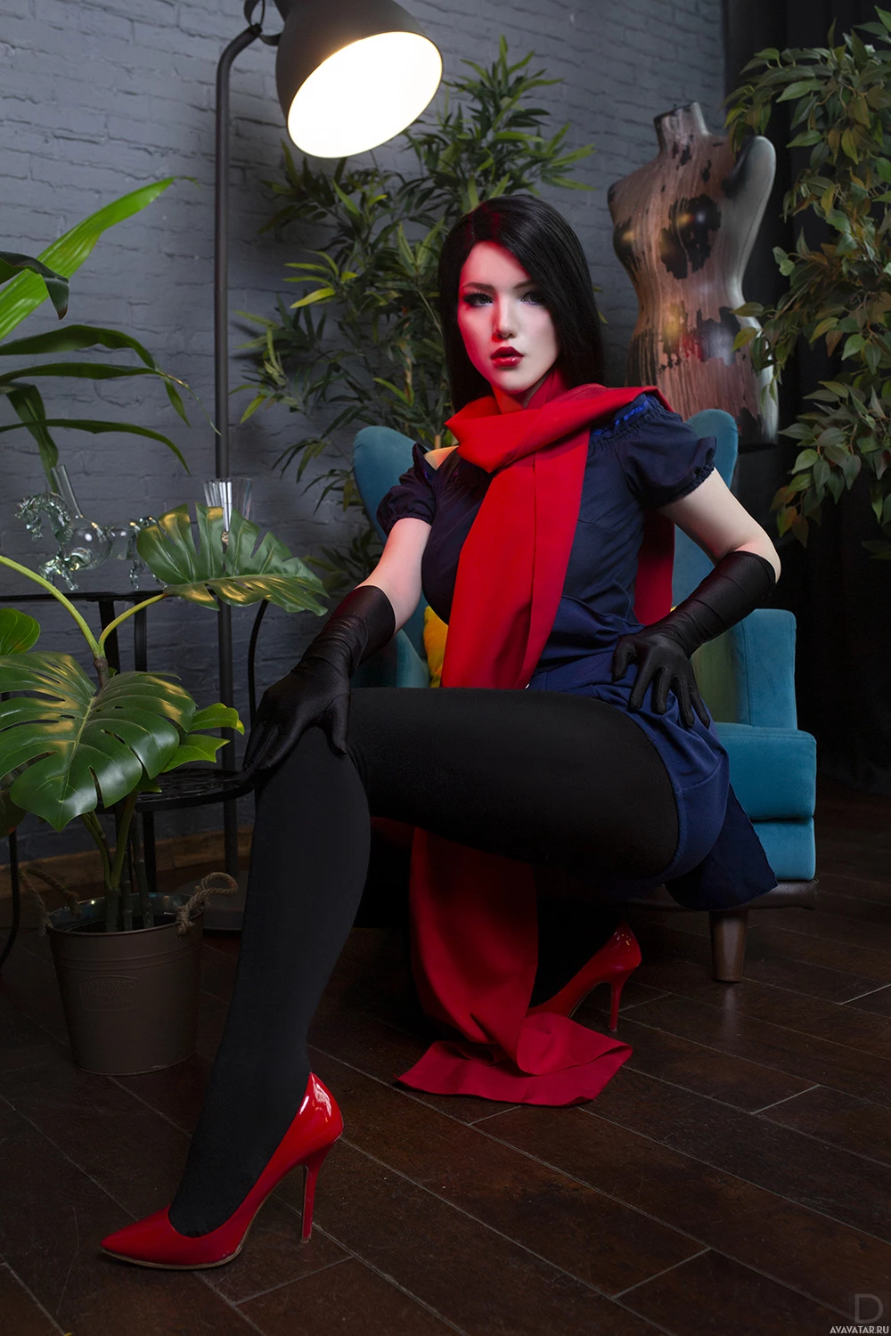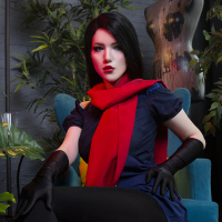 a cosplay costume. Her hair is dark, and she appears to have makeup that enhances her features, which could contribute to her appearance as someone who enjoys or participates in