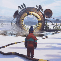a cold environment or winter season. There are elements in the background that resemble machinery or scientific equipment, which might indicate that the scene is related to some kind of