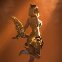a playful pose, set against a dramatic backdrop that suggests a magical or fantasy setting. The costume includes gold