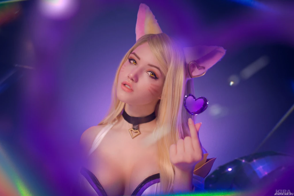 The image features a person dressed in cosplay attire, resembling the character Ahri from