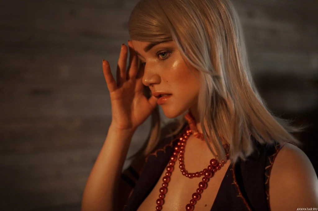 In the picture, there is a person wearing an outfit that appears to be inspired by the character Keira Metz from "The Witcher 3: Wild Hunt"