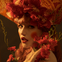 a floral crown and has makeup that matches her surroundings. The background suggests a decorative setting, which might imply that she is at an event like