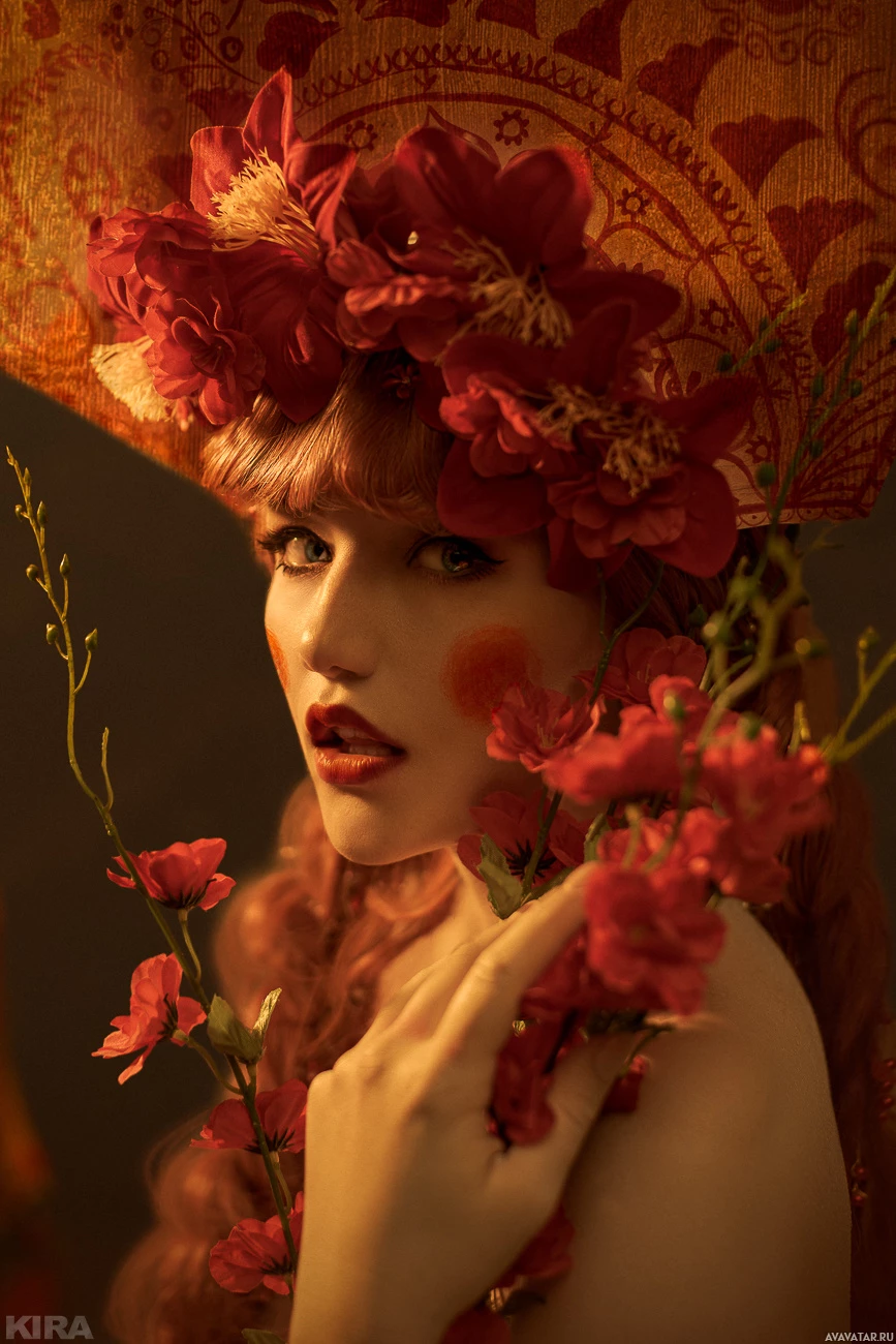 red hair holding what appears to be flower petals, possibly from a rose or a similar type of flower. She is wearing