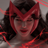 The image depicts a person dressed as the Scarlet Witch from comic books, particularly known for her red headpiece and costume. They are set against a dramatic background with red streaks or cracks that add to the mystical or powerful appearance of the character.