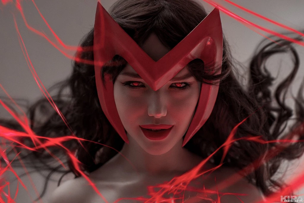 На картинке изображен человек, одетый как Алая ведьма из комиксов, особенно известная своим красным головным убором и костюмом. Они расположены на эффектном фоне с красными прожилками или трещинами, которые придают мистический или могущественный вид персонажу.