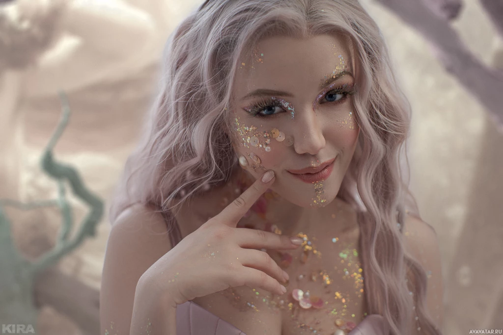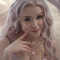 a playful expression on their face and are wearing what appears to be costume-like attire, possibly related to a fantasy or fairytale theme. They are adorned with sparkly substances that could be glitter or makeup designed to look like