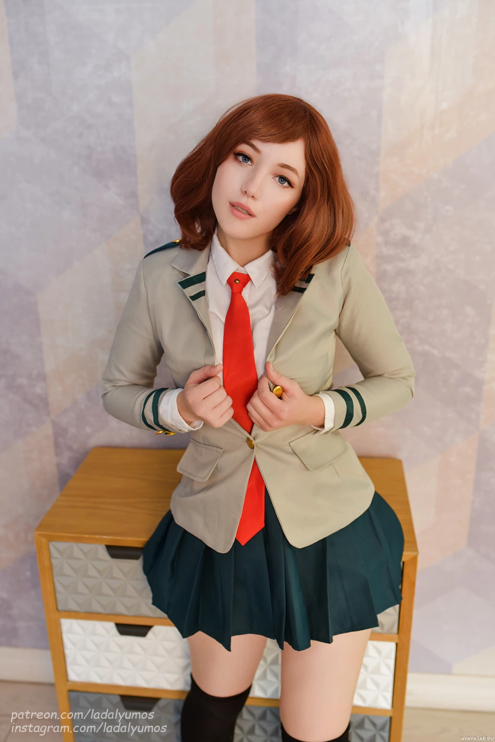 red hair and is wearing a school uniform that includes a blazer with a tie, a skirt, and possibly a badge on the lapel, which is consistent with cosplaying as a character from a Japanese animation. There's no