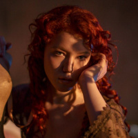 red hair, wearing what appears to be historical or fantasy-themed clothing. She has
